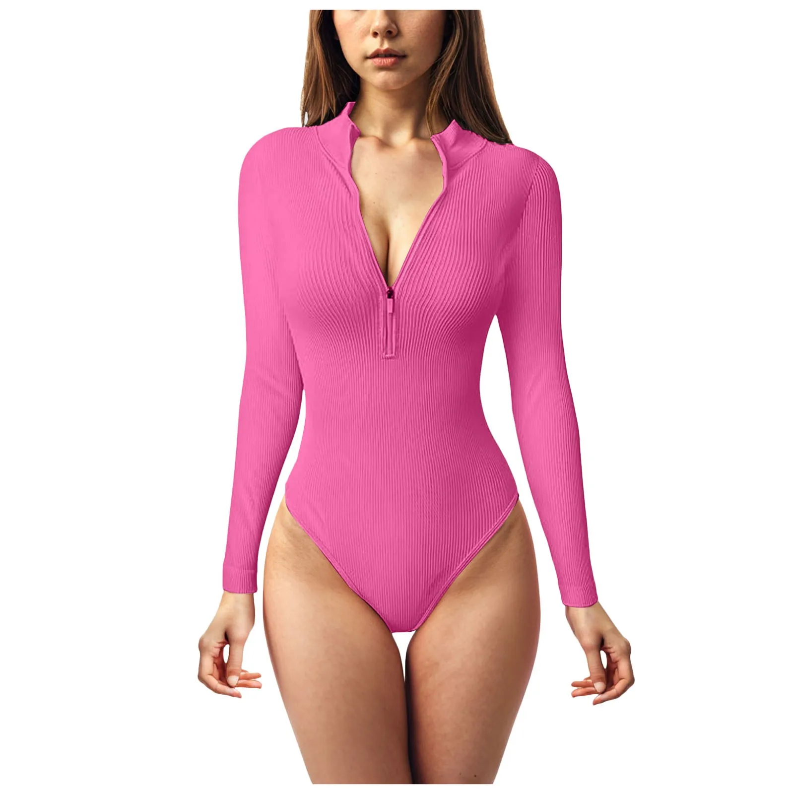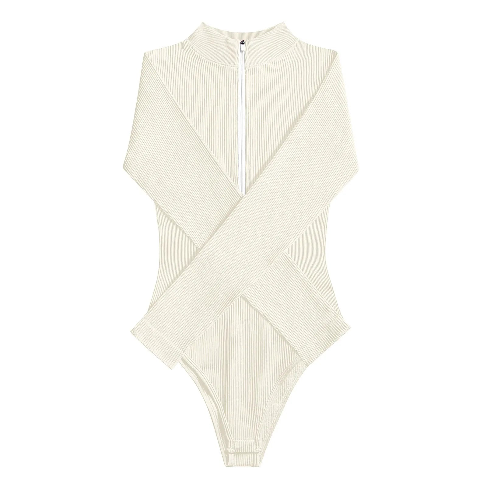 Women Ribbed One-Piece Bodysuits Half Zip Up